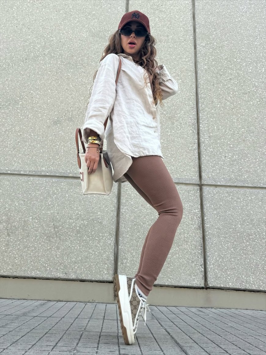 ظهرت ميريام واقفة على أطراف أصابعها بحذاء رياضي خفيف، منسّقة إياه مع إطلالة شتوية مريحة تشمل ليغنغ بني وتوب باللون نفسه، تكمّلها قميص أبيض فضفاض لمسة عصرية. وأكملت إطلالتها بحقيبة متوسطة الحجم باللون الأبيض من غوتشي (Gucci)، أضفت على اللوك توازناً بين البساطة والفخامة.