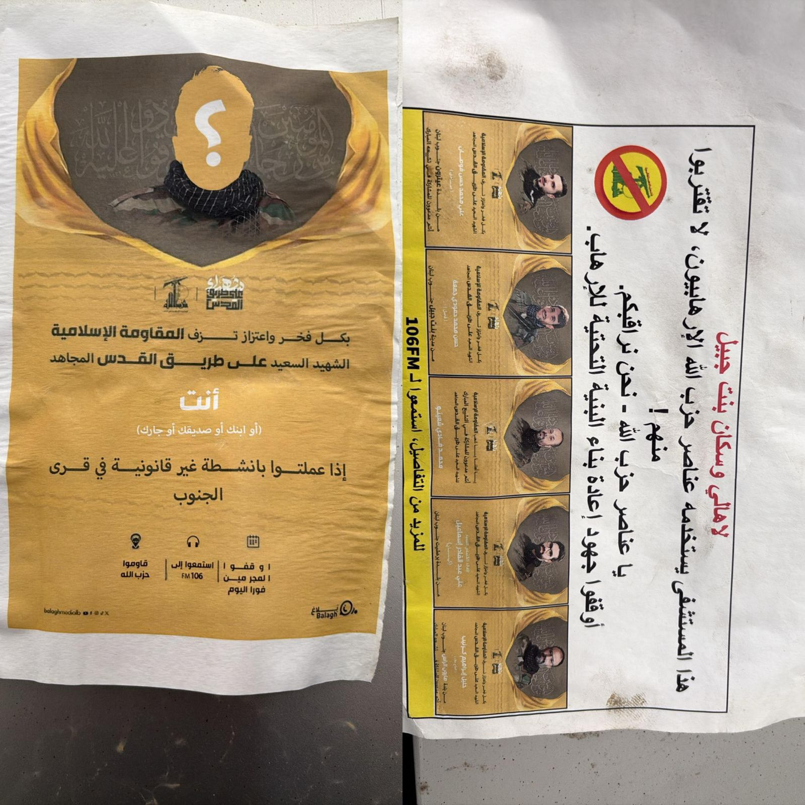 حيث جاء في المناشير : بكل فخر واعتزاز تزف المقاومة الاسلامية الشهيد السعيد على طريق القدس المجاهد "أنت" أو "ابنك" او "صديقك" او "جارك"، اذا عملت بانشطة غير قانونية في قرى الجنوب.