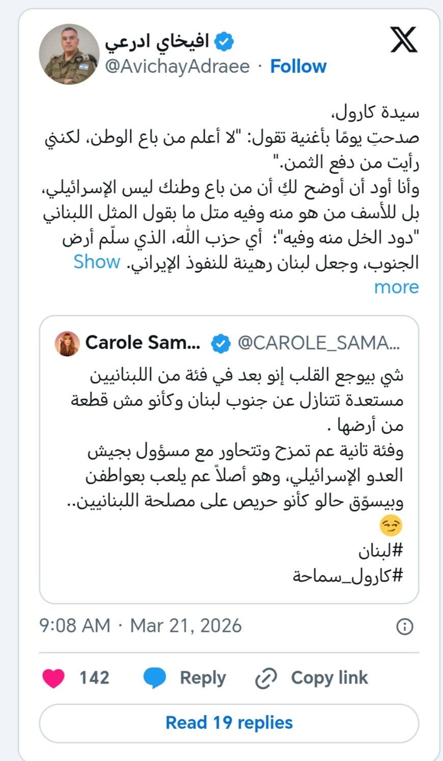 سجال غير مسبوق بين أدرعي وكارول سماحة على "أكس"… رسائل سياسية بغطاء فني تشعل مواقع التواصل في توقيت حساس